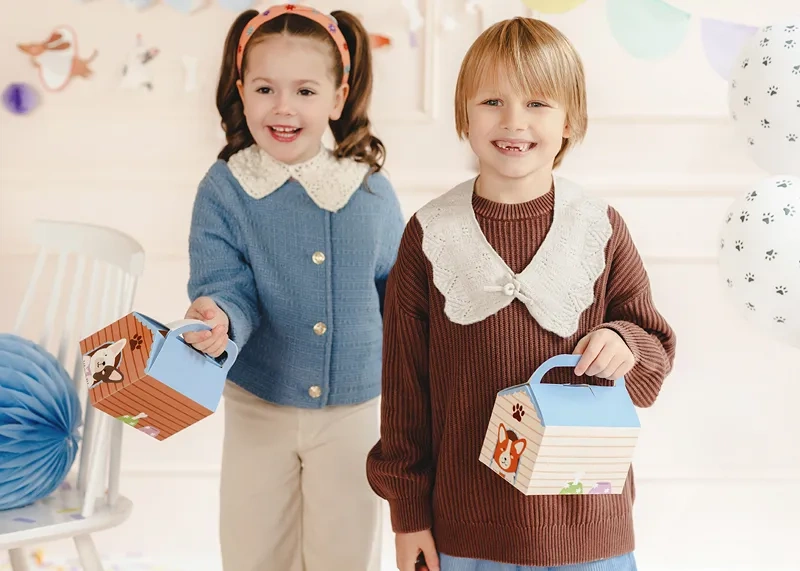- Ozdobne pudełka na ciasto z papieru w kształcie Budy dla psa, set zawiera 2 rodzaje budy po 3 sztuki. Wymiary pudełka po złożeniu ok. 15,5 x 10 x 16 cm.