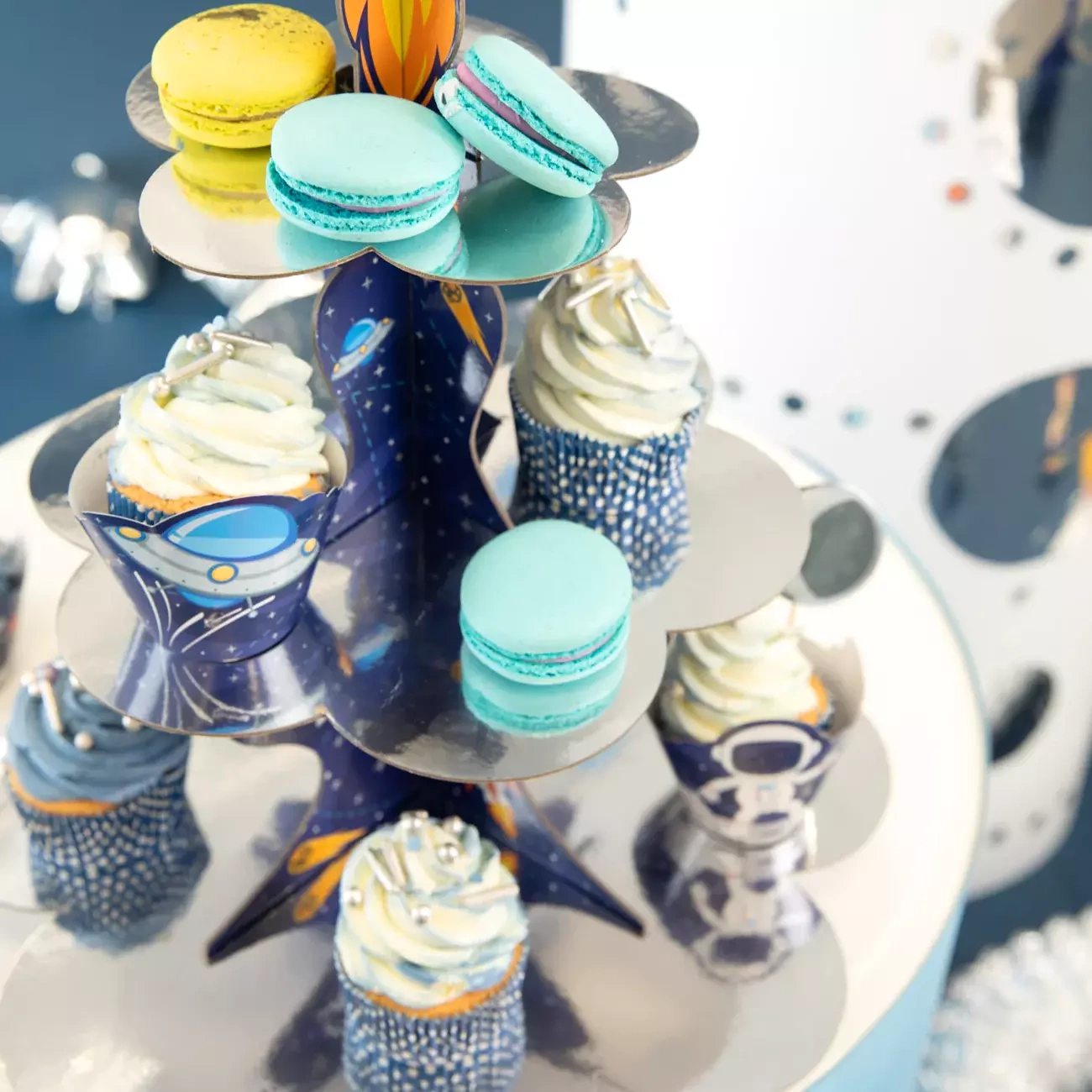 Fantastyczna a zarazem praktyczna dekoracja stołu imprezowego - patera do babeczek z kolekcji Kosmos.