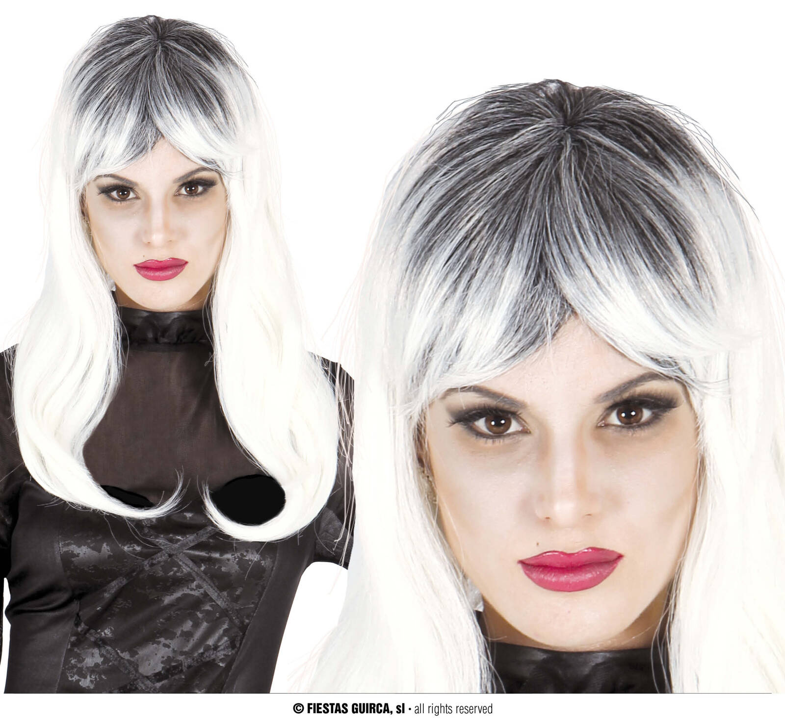 - Peruka damska, długie białe włosy z czarnymi odrostami