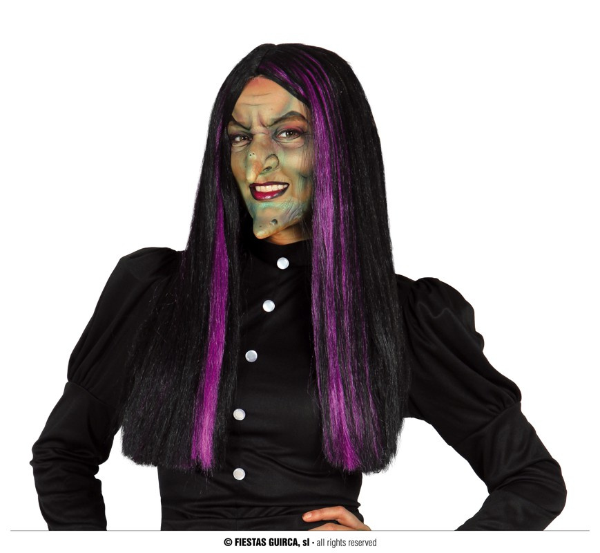 - Długa czarna peruka z fioletowymi pasemkami