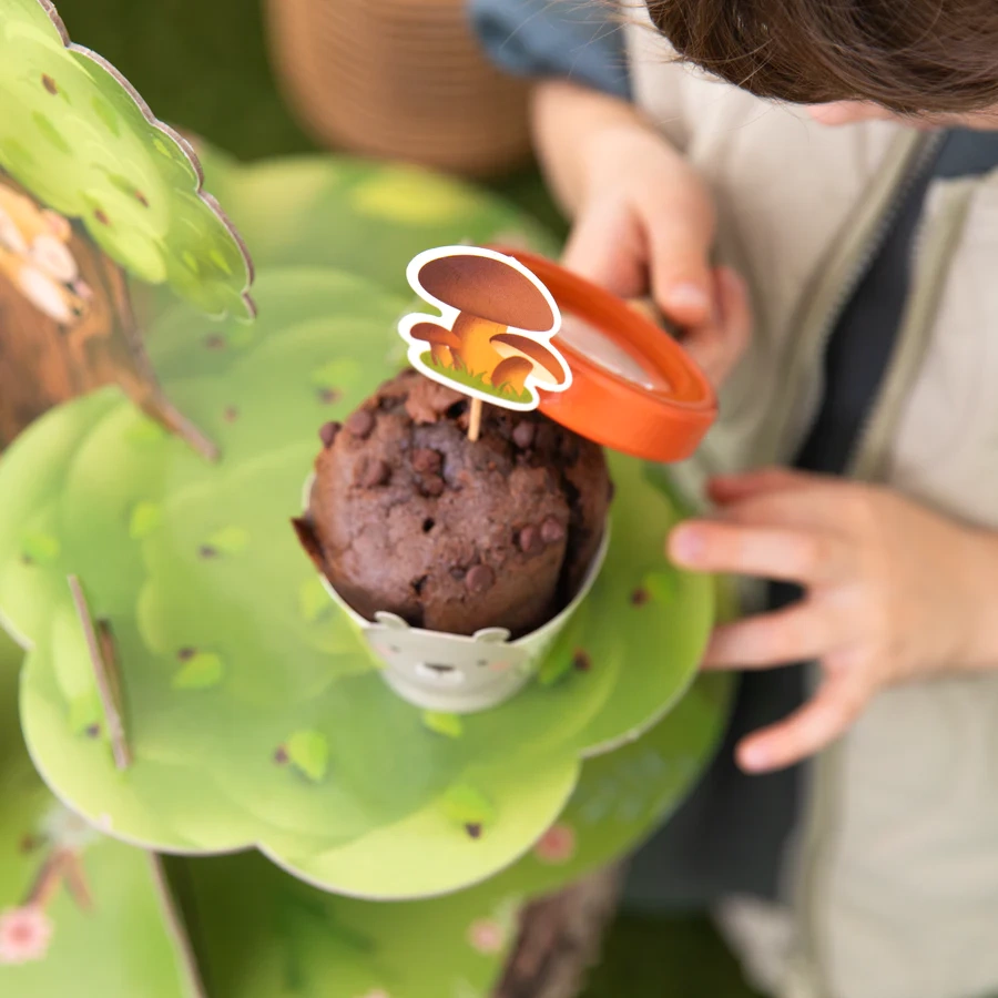 Zestaw topperów na drewnianych patyczkach doskonale wpisuje się w tematykę przyjęć związanych z lasem i jego mieszkańcami.