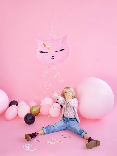 - Piniata w kształcie kotka w kolorze różowym do wypełniania upominkami, wymiary ok. 35 x 27 x 9 cm.