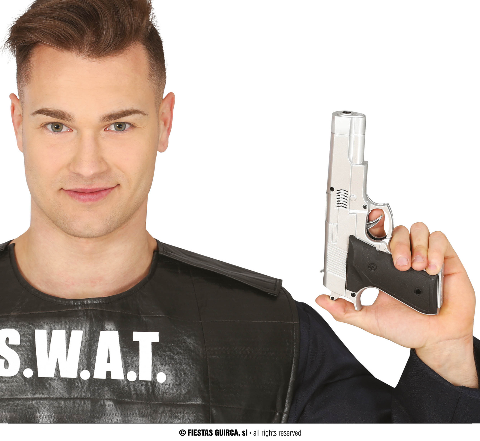 - Srebrny pistolet to idealny dodatek do stroju dla policjanta, SWAT.