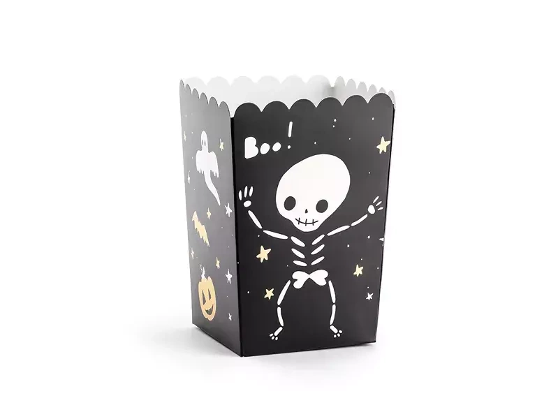 • Pudełka na popcorn BOO! W kolorze czarnym z białym i złotym metalizowanym nadrukiem, wymiary po złożeniu ok. 7 x 7 x 12.5 cm.