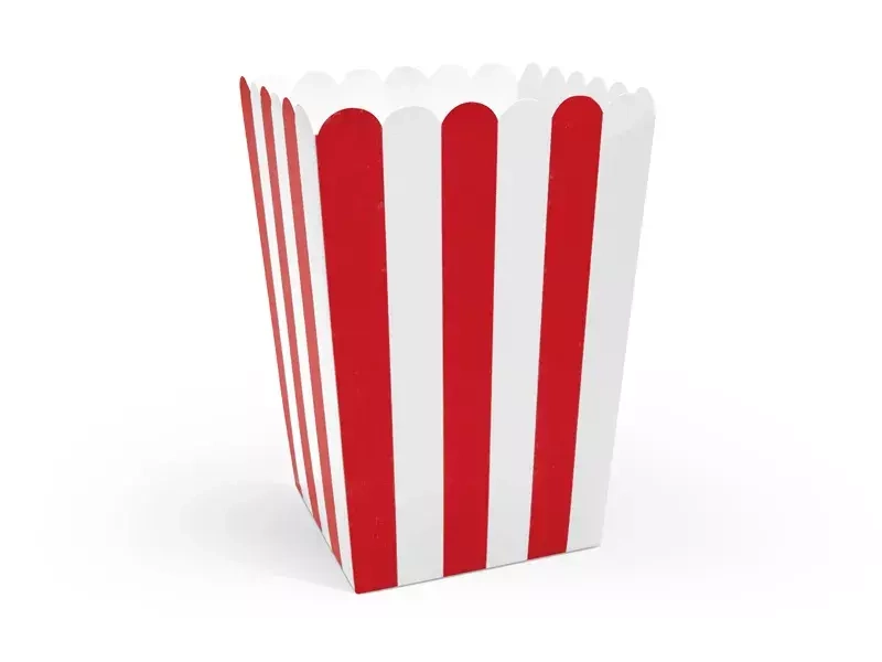 - Pudełka na popcorn w kolorze czerwonym w białe paski,
