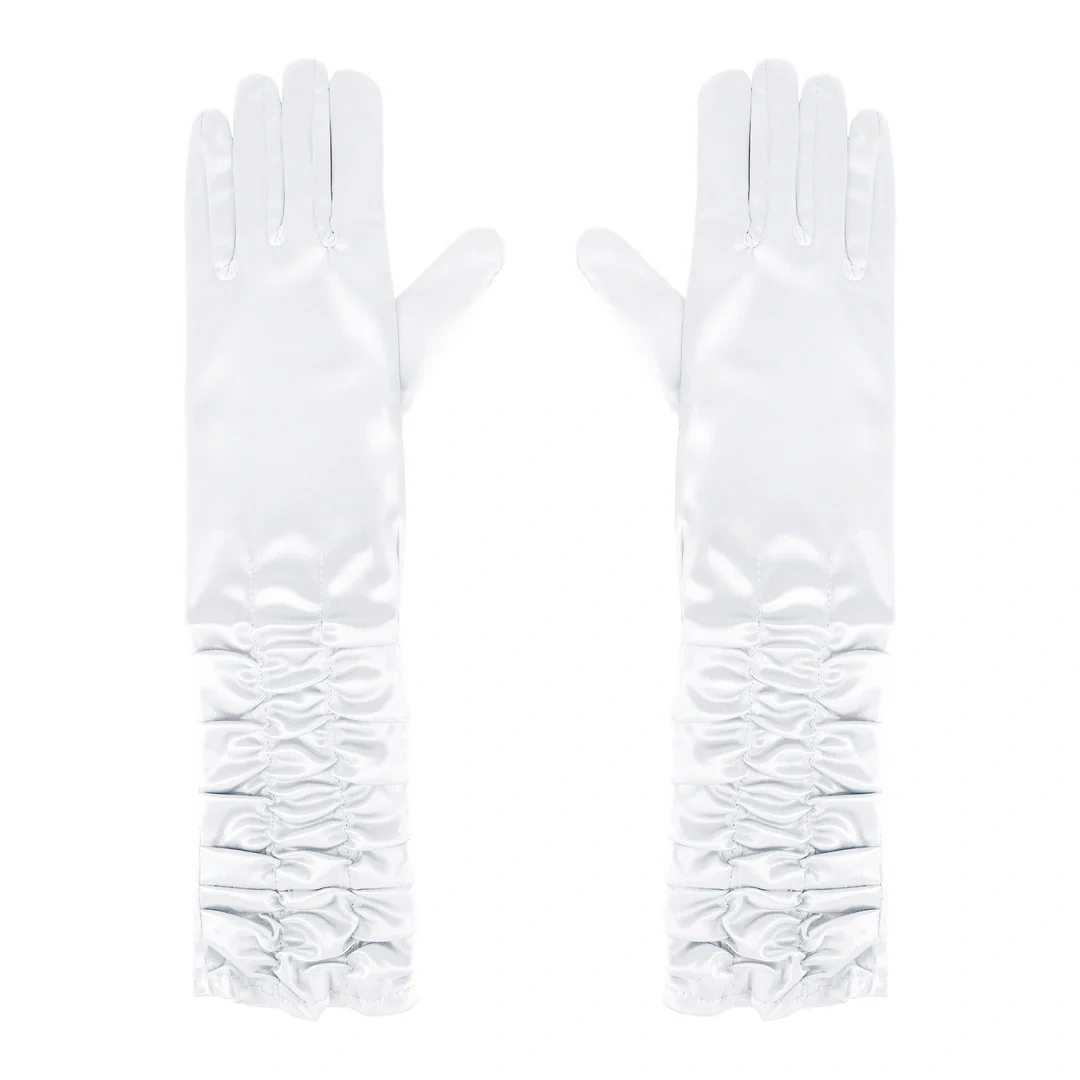 Wyjątkowo efektowne, sięgające za łokieć rękawiczki z połyskującej satyny to klasyczny dodatek, który natychmiast podnosi rangę każdej stylizacji. Dzięki subtelnemu marszczeniu materiału i neutralnemu, białemu kolorowi świetnie sprawdzą się zarówno na eleganckich przyjęciach, jak i podczas imprez tematycznych, sesji zdjęciowych czy wieczorów panieńskich.