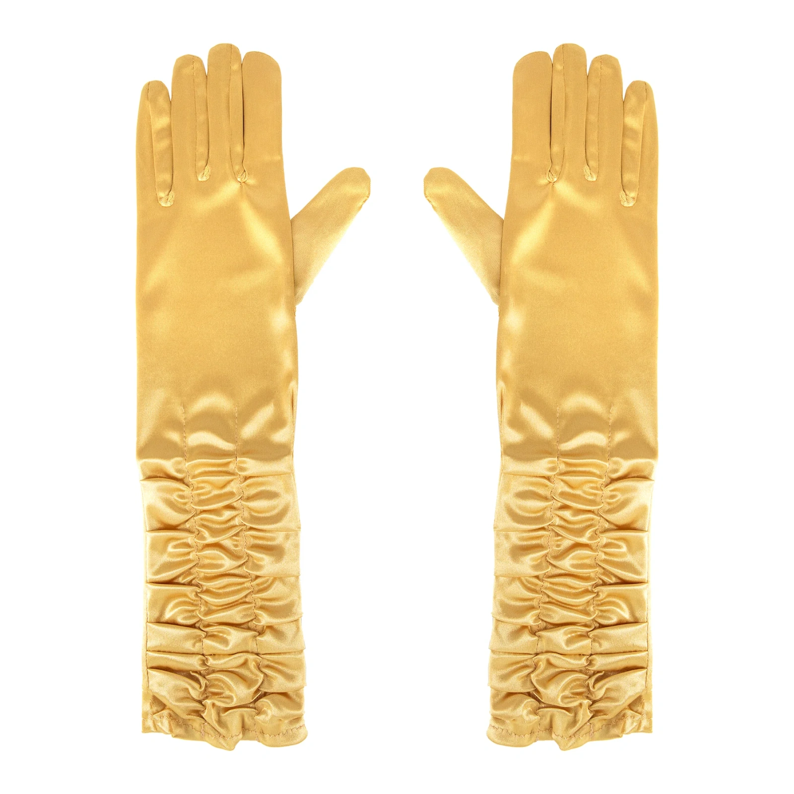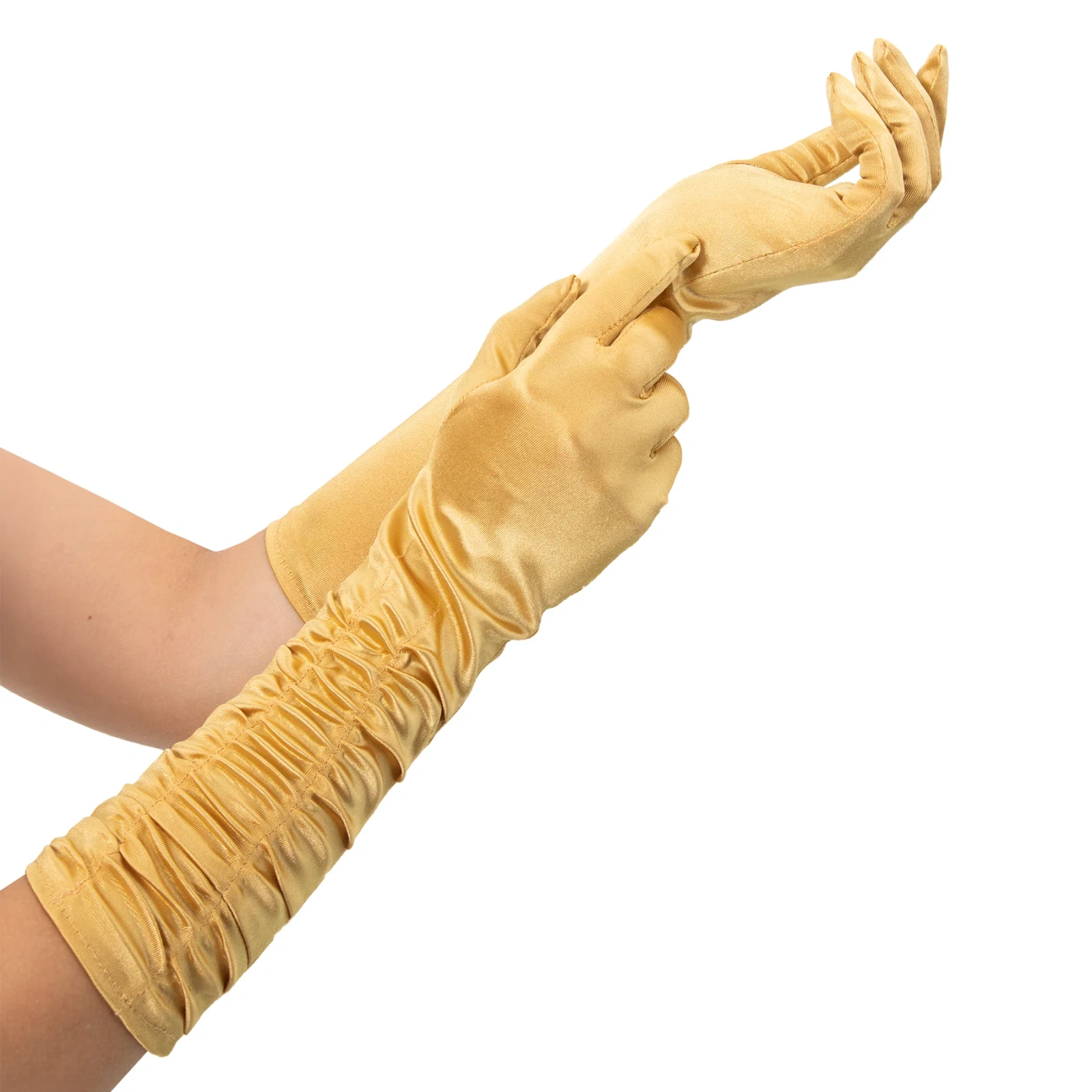 Złote rękawiczki satynowe z marszczeniem – efektowny połysk i długość podkreślająca sylwetkę