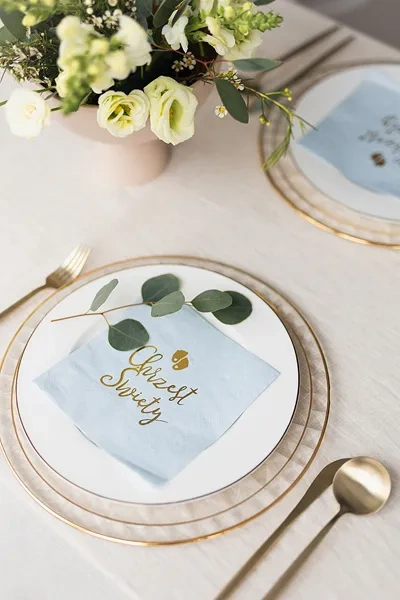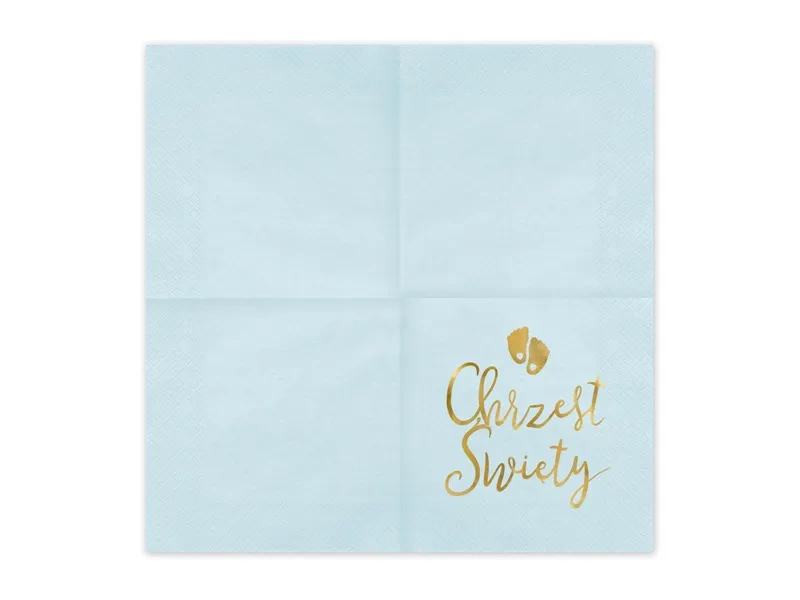 - Serwetki papierowe w kolorze jasnoniebieskim ze złotym nadrukiem i napisem "Chrzest Święty", wymiary po rozłożeniu ok. 33 x 33 cm, wymiary po złożeniu ok. 16.5 x 16.5 cm.