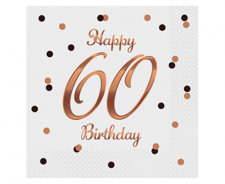 Serwetki Happy 60 Birthday, białe, nadruk różowo-złoty, 33x33 cm/ 20 szt.