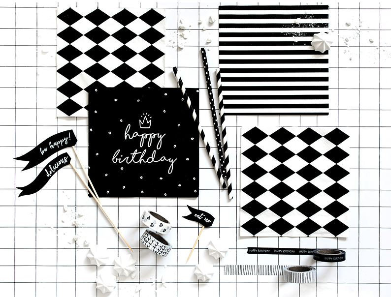 - Serwetki trójwarstwowe Happy Birthday w kolorze czarnym z białym nadrukiem.