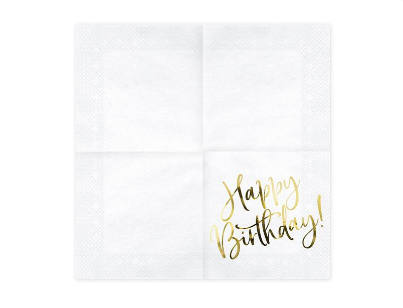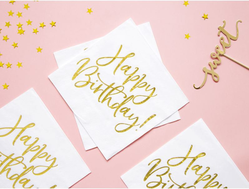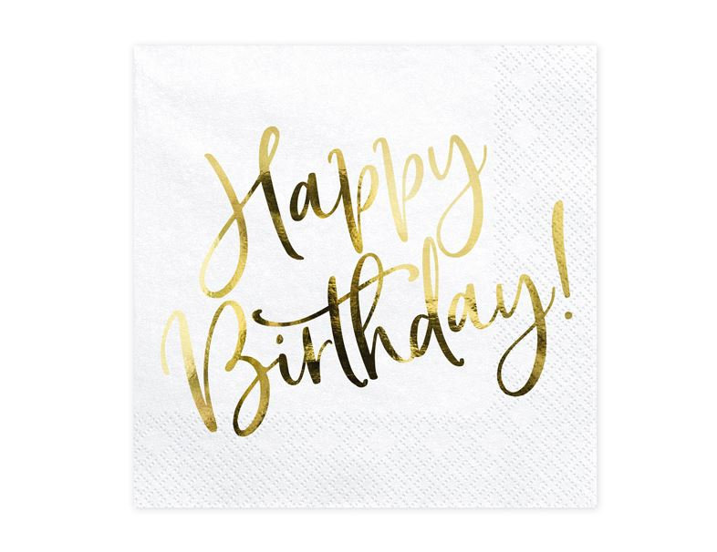 - Serwetki papierowe w kolorze białym, ze złotym metalizowanym napisem Happy Birthday.