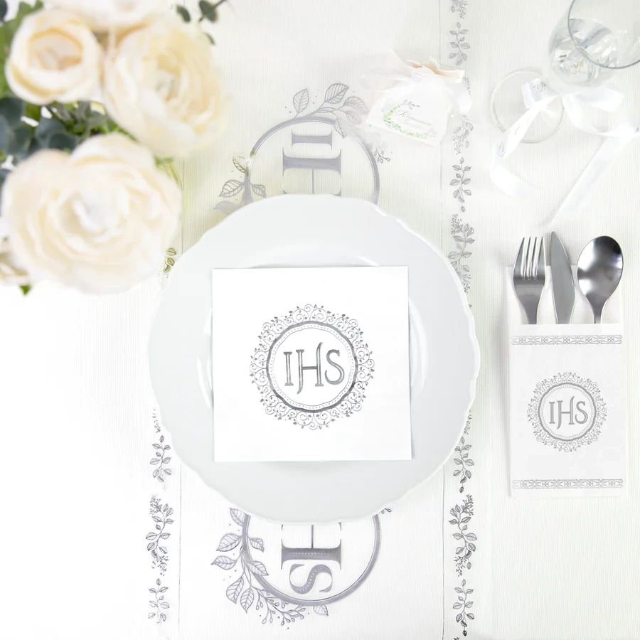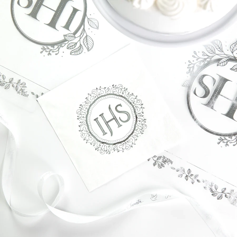- Białe serwetki komunijne ze srebrnym motywem hostii, będą praktycznym i eleganckim dodatkiem do uroczystej zastawy stołowej.