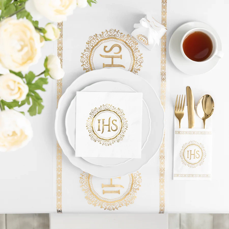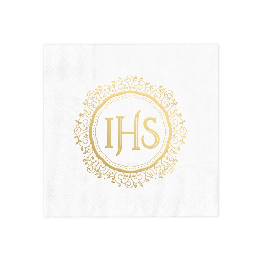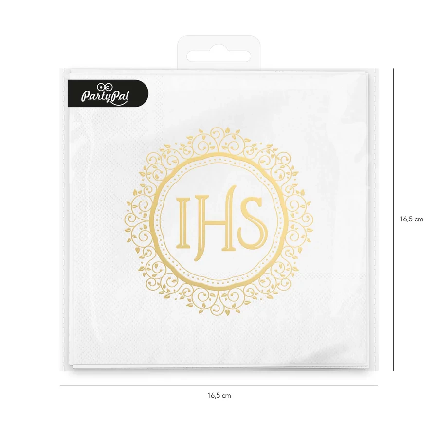 - Głównym motywem na serwetce jest hostia w złotym kolorze. W centralnej części znajduje się napis IHS otoczony ozdobnymi okręgami. Całość otoczona jest delikatnym koronkowym motywem.