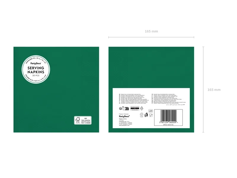 • Serwetki papierowe w kolorze ciemnozielonym. Wymiary po rozłożeniu ok. 33 x 33 cm, wymiary po złożeniu ok. 16,5 x 16,5 cm.
