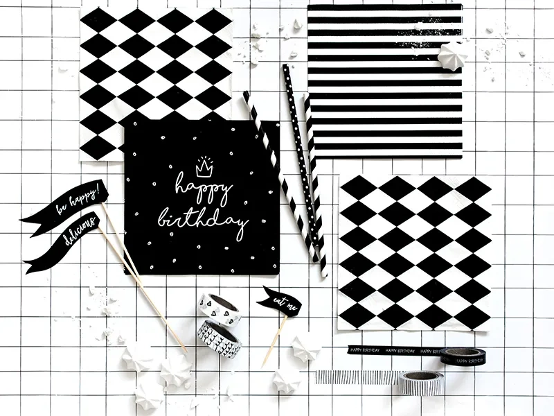 - Serwetki trójwarstwowe Paski w kolorze białym z czarnym nadrukiem, wymiary 33x33 centymetry.