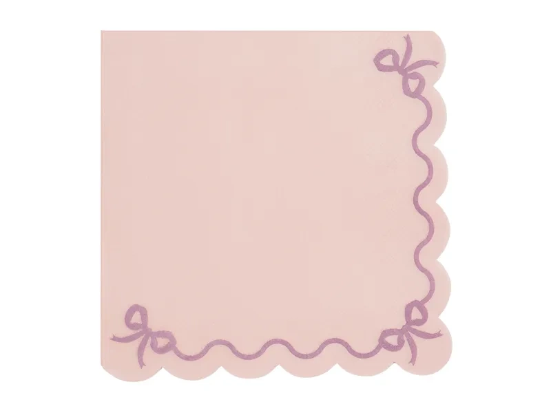 - Serwetki papierowe w kolorze jasno różowym zakończone falbanką. Na serwetkach nadruk wstążki z kokardką. Wymiary po rozłożeniu ok. 33 x 33 cm, wymiary po złożeniu ok. 16,5 x 16,5 cm.