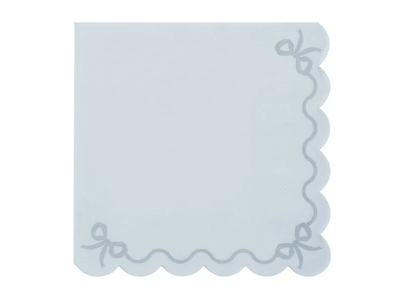 • Serwetki papierowe w kolorze mglistym niebieskim zakończone falbanką. Na serwetkach nadruk wstążki z kokardką. Wymiary po rozłożeniu ok. 33 x 33 cm, wymiary po złożeniu ok. 16,5 x 16,5 cm.