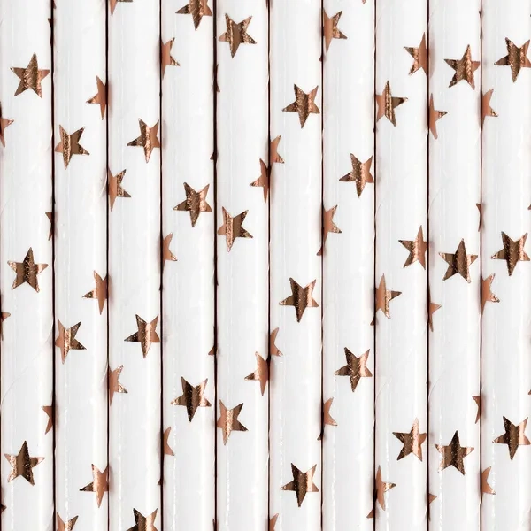 • Słomki papierowe w kolorze białym, z metalizowanymi gwiazdkami w kolorze jasnego różowego złota, długość ok. 19.5 cm