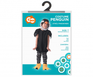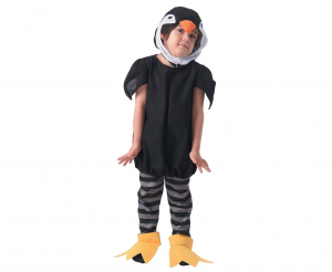 • Strój pingwina dla dzieci. W skład stroju wchodzą: bluzka, spodnie, kapturek głowy pingwina, nakrycia na stopy (płetwy).