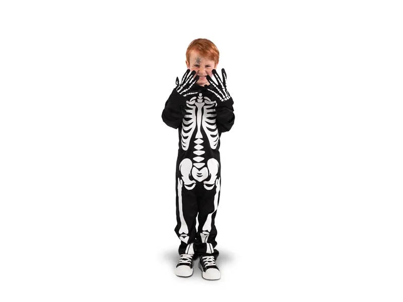 • Strój dziecięcy Kościotrup w kolorze czarno-białym, rozmiar 116-128. Zestaw zawiera strój i rękawiczki. Skład: poliester - 100%. Sposób konserwacji: prać ręcznie.