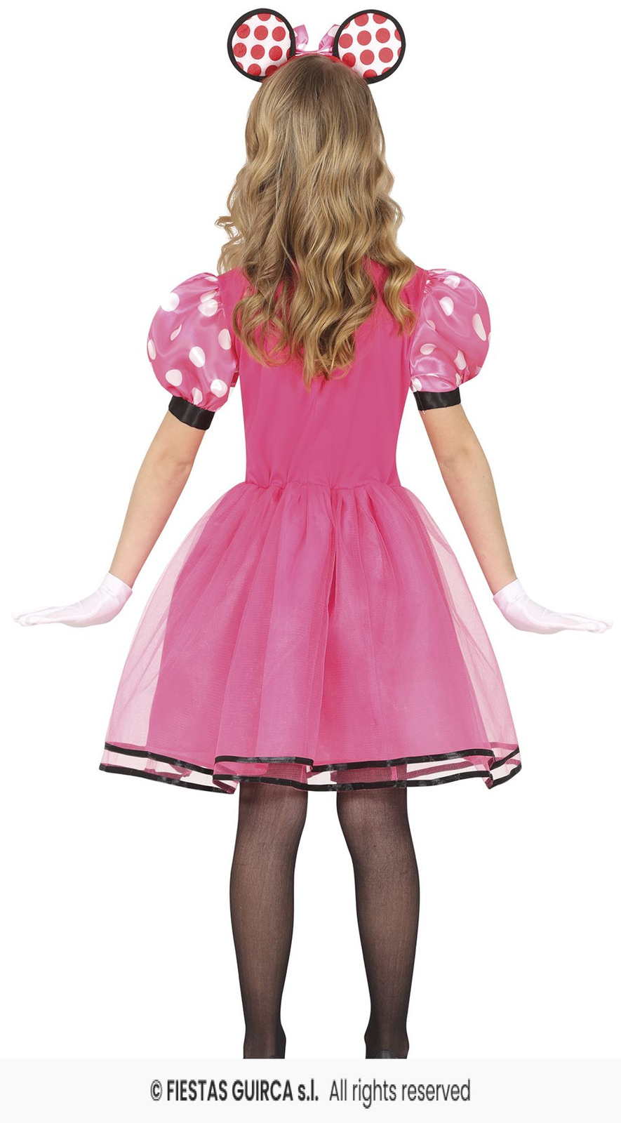W zestawie znajduje się wygodna sukienka oraz opaska z charakterystycznymi mysim uszami i kokardką — wszystko, co potrzeba, by stworzyć czarującą stylizację w stylu małej, różowej myszki. Kolorystyka w odcieniach różu i kontrastujące detale tworzą przyjazny i przyciągający uwagę look.