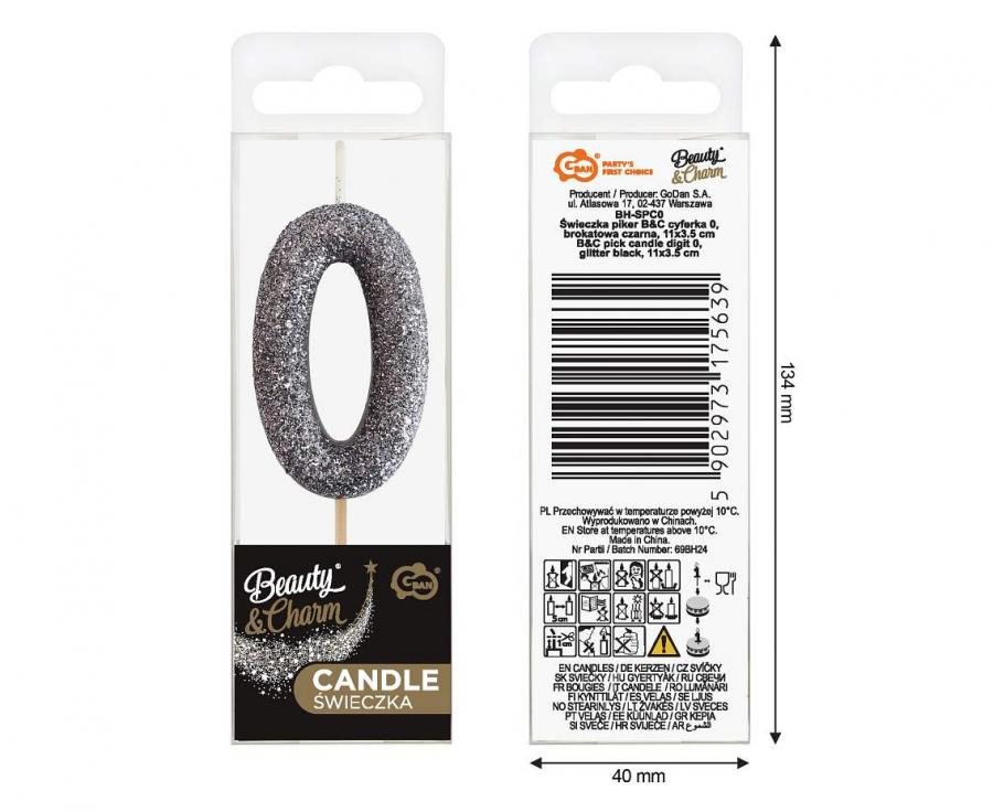 Świeczka piker B&C cyferka 0, czarna, NOWY BIO BROKAT, 11x3.5 cm