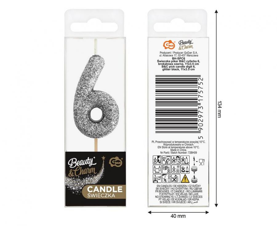 Świeczka piker B&C cyferka 6, czarna, NOWY BIO BROKAT, 11x3.5 cm