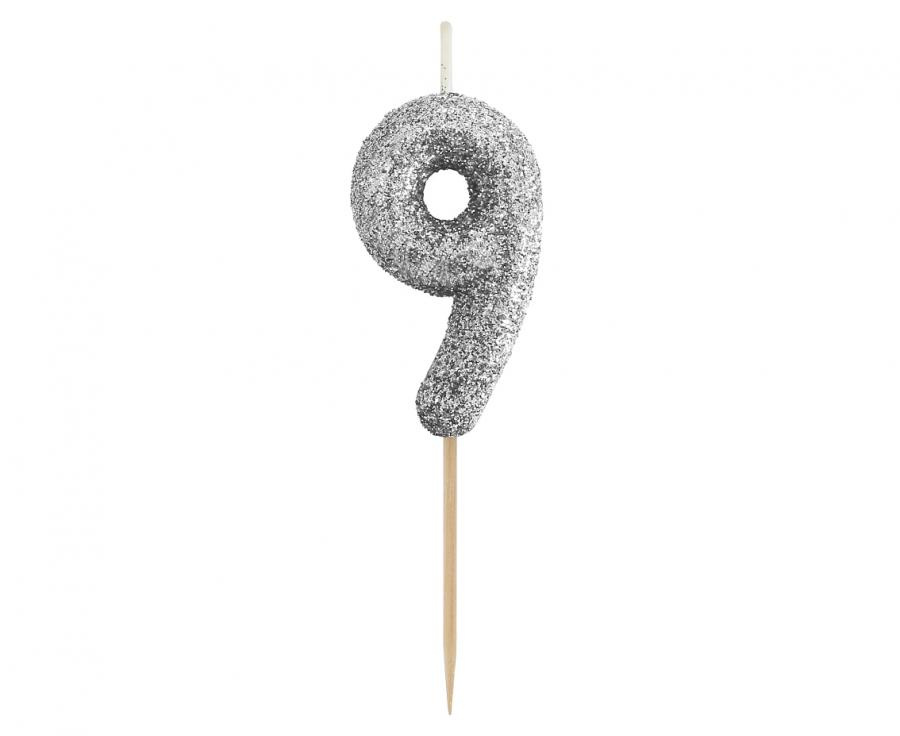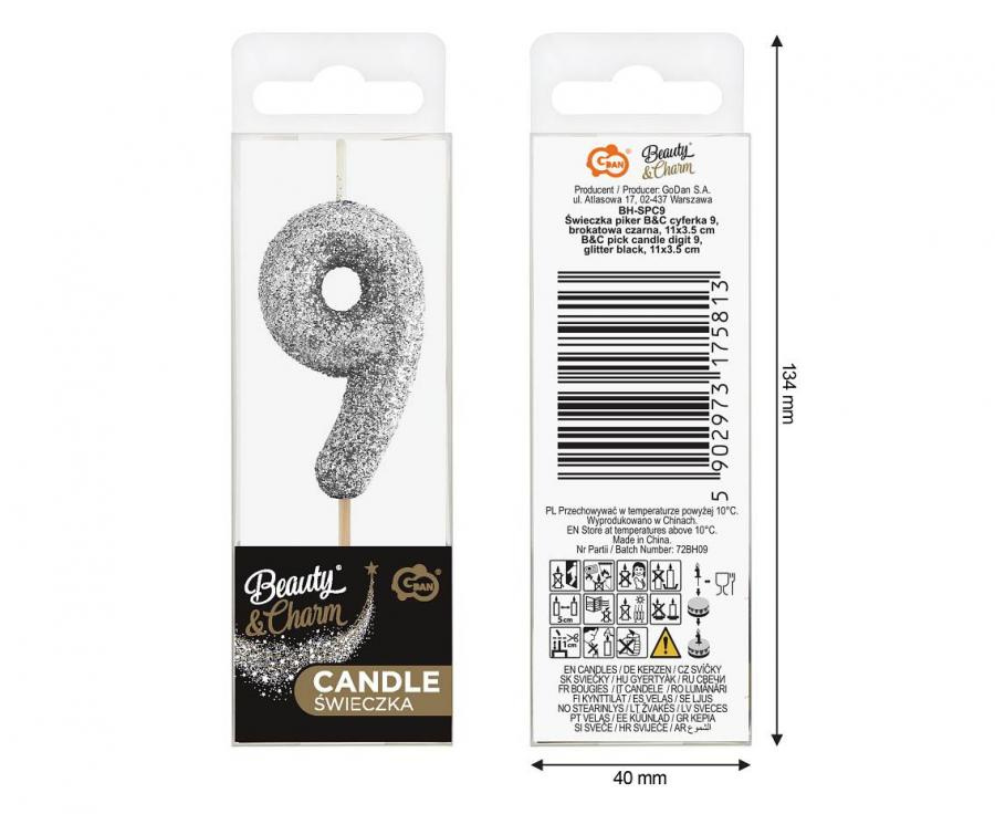 Świeczka piker B&C cyferka 9, czarna, NOWY BIO BROKAT, 11x3.5 cm