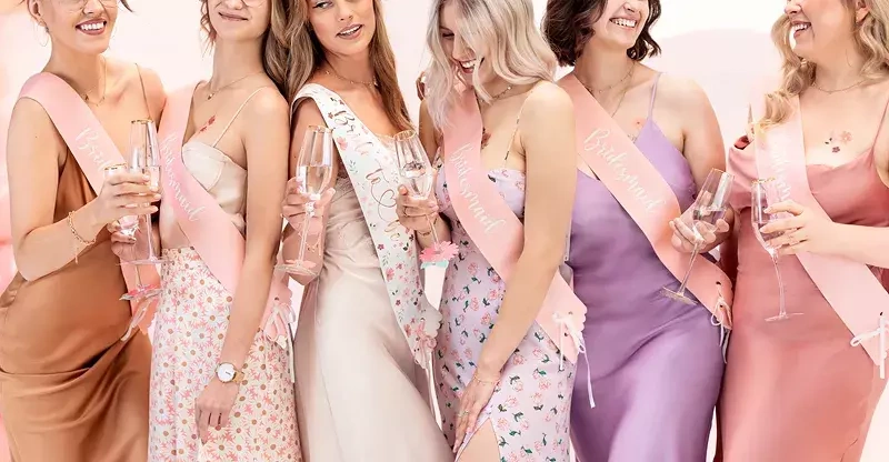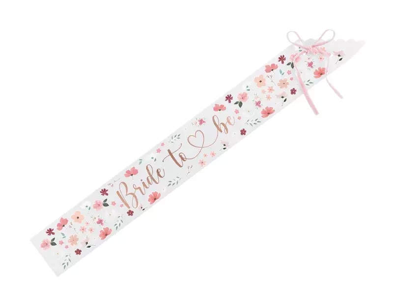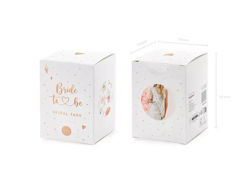 - Szarfa papierowa Bride to be w kolorze białym z kolorowym nadrukiem oraz metalizowanym napisem w kolorze różowego złota,