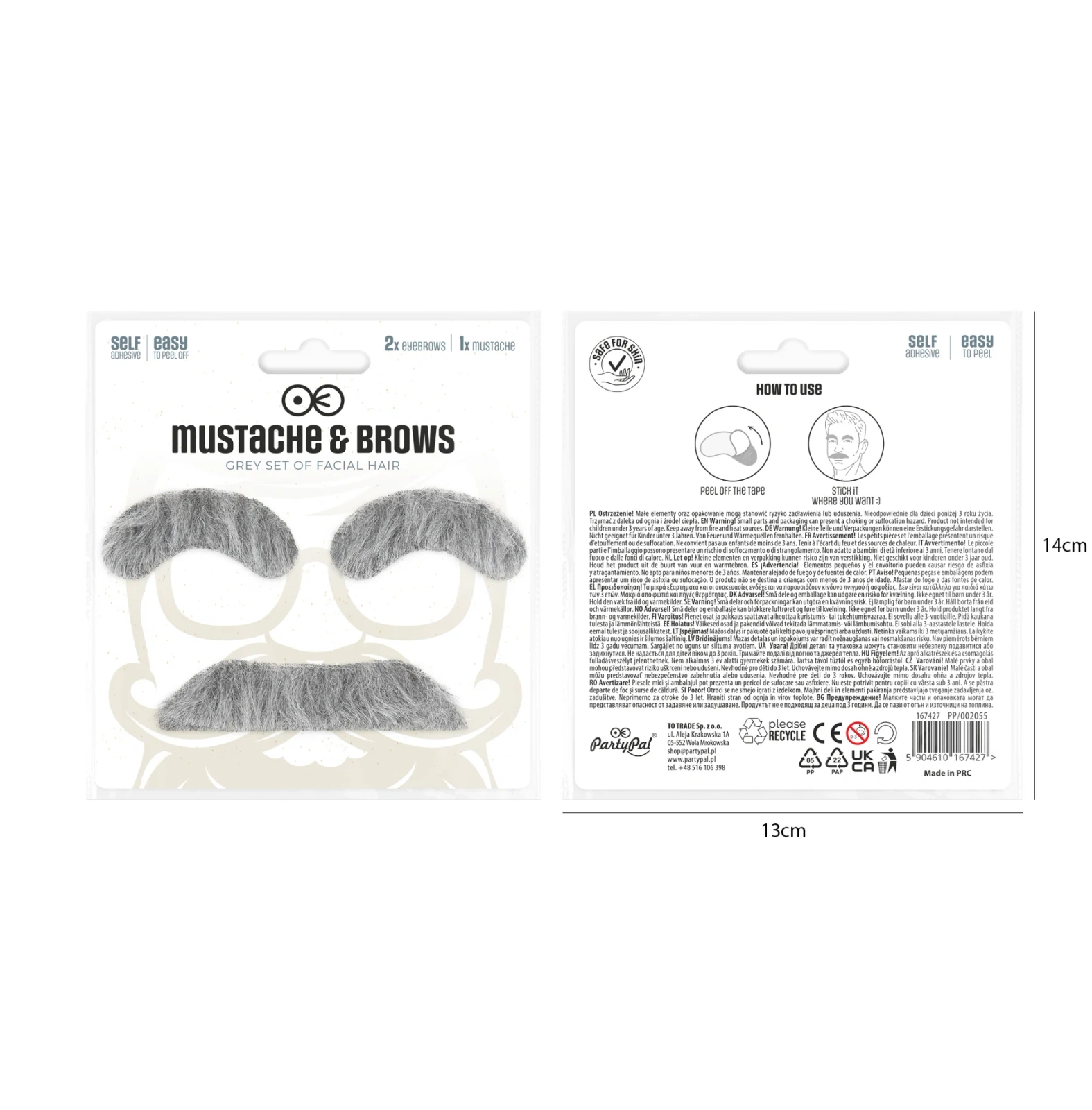 Zestaw zawiera jedne wąsy oraz parę gęstych, wyrazistych brwi w odcieniu naturalnej szarości. Drobne, miękkie włókna układają się jak prawdziwe włosy na twarzy, dzięki czemu efekt końcowy wygląda zaskakująco realistycznie zarówno z bliska, jak i na zdjęciach.