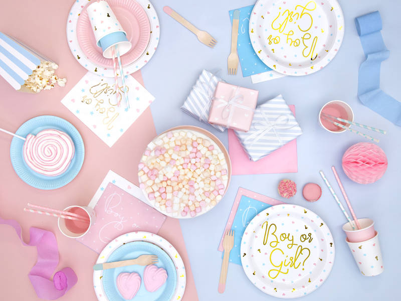 - Talerzyki papierowe, mix kolorów ze złotym metalizowanym napisem Boy or Girl,