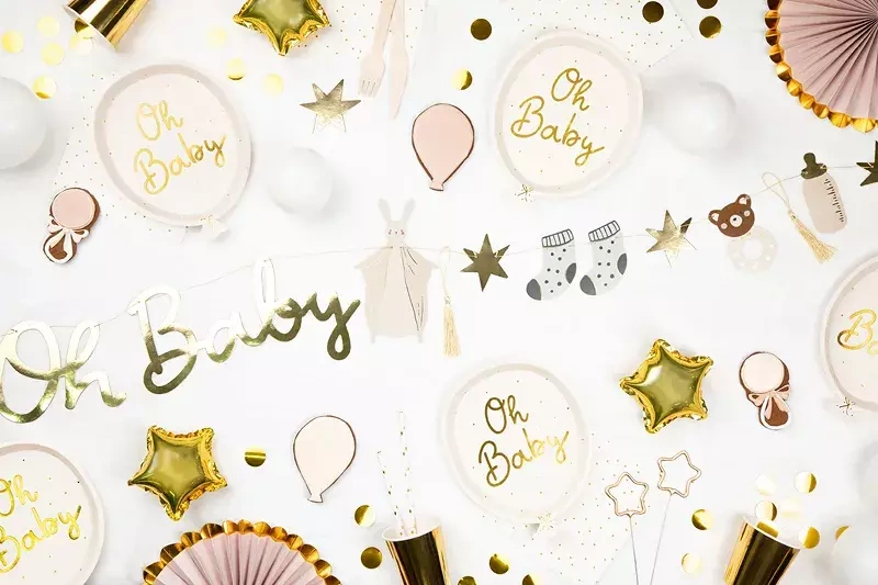 - Talerzyki papierowe w kształcie balonika z napisem Oh baby,