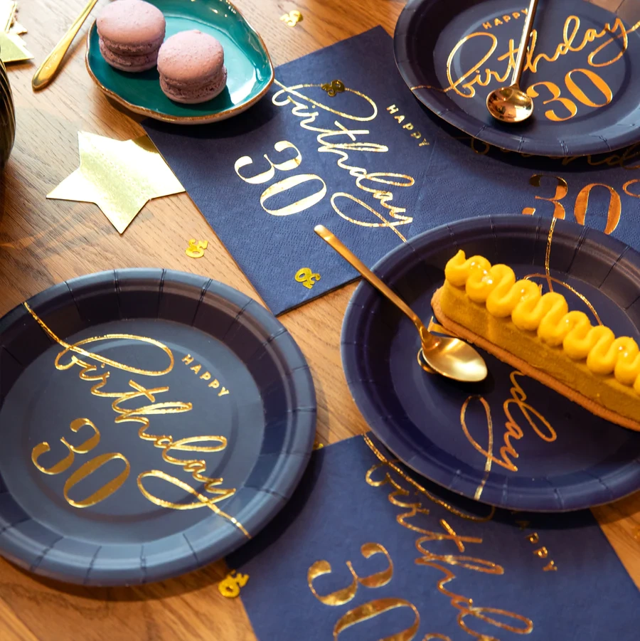 - To bardzo elegancka propozycja na jubileuszową zastawę. matowe, granatowe tło talerzyka pięknie podkreśla złoty, połyskujący napis Happy Birthday 30.