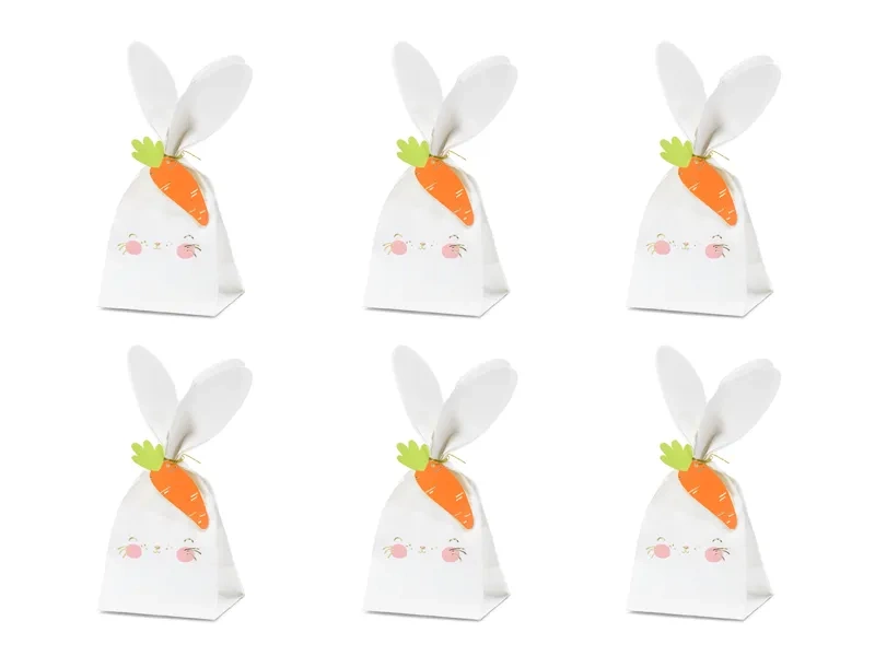 - Torebki na słodycze Króliki, wykonane z papieru, zestaw zawiera: 6 torebek w kolorze białym, 6 zawieszek w kształcie marchewki, 3 nitki w kolorze złotym, wymiary ok. 7.5 x 9 x 22.5 cm.