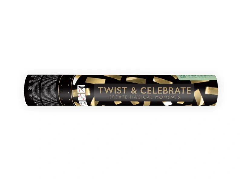 - Tuba strzelająca metalicznym konfetti w kolorze złotym, długość 28 centymetrów.