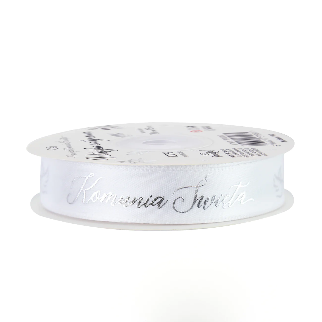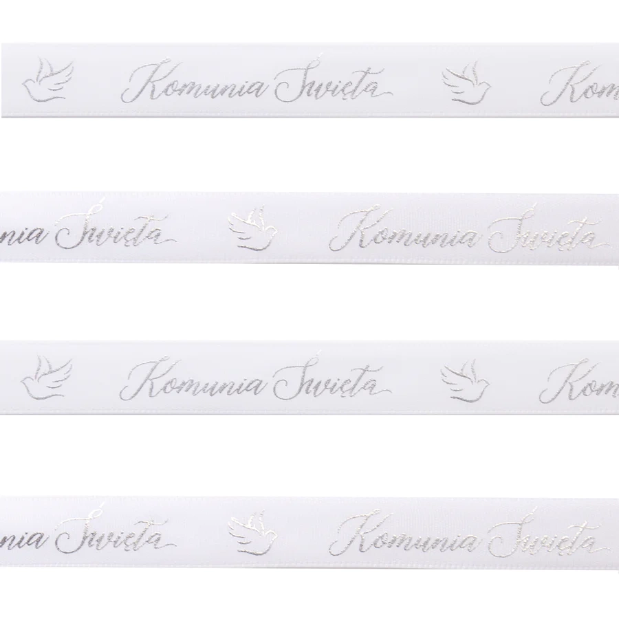 - Elegancka satynowa wstążka z finezyjnym napisem Komunia Święta i z gołąbkami. Może posłużyć do dekoracji wielu elementów w tym prezentów, stołu komunijnego czy krzeseł.
