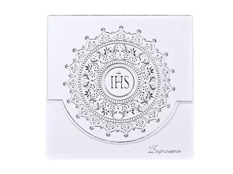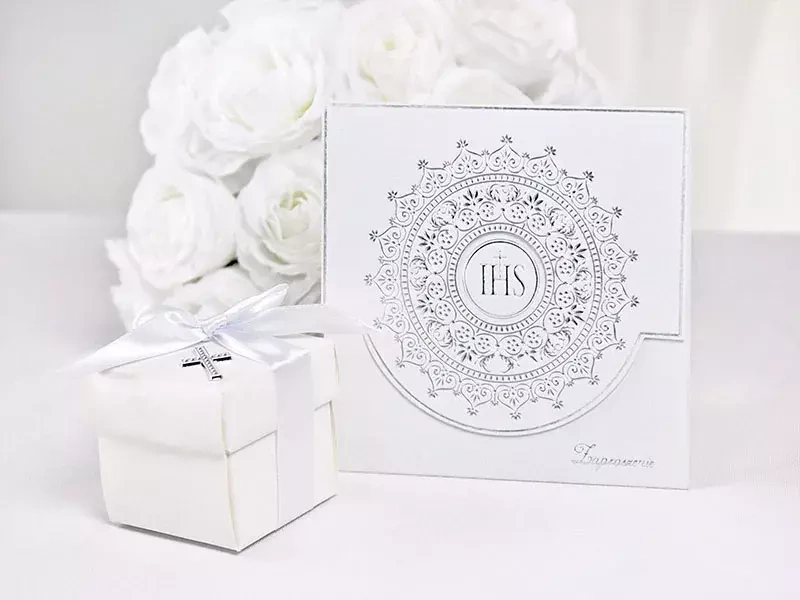 - Zaproszenia komunijne w kolorze białym ze srebrnym ornamentem,