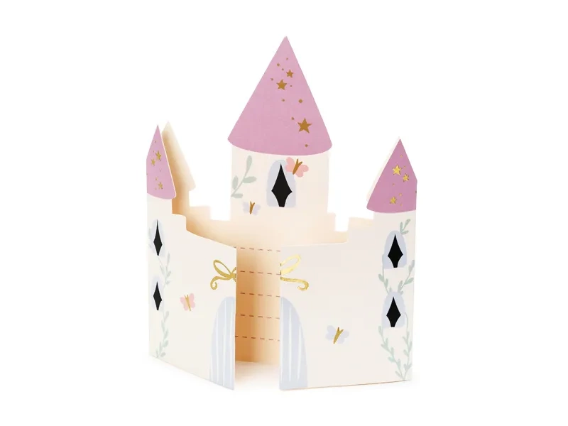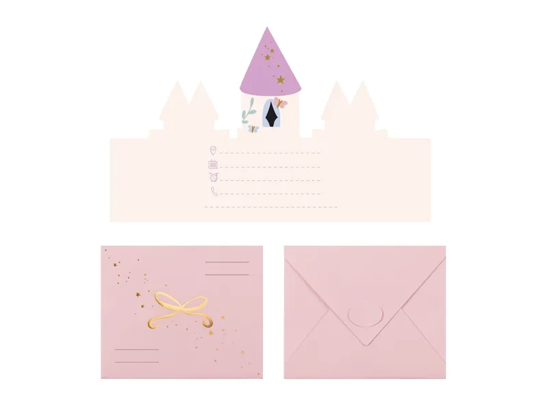 - Zaproszenia w kształcie Zamku w kolorze różowym z kolorowym nadrukiem, wymiary ok. 12.5 x 15.5 cm. Zestaw zawiera koperty.