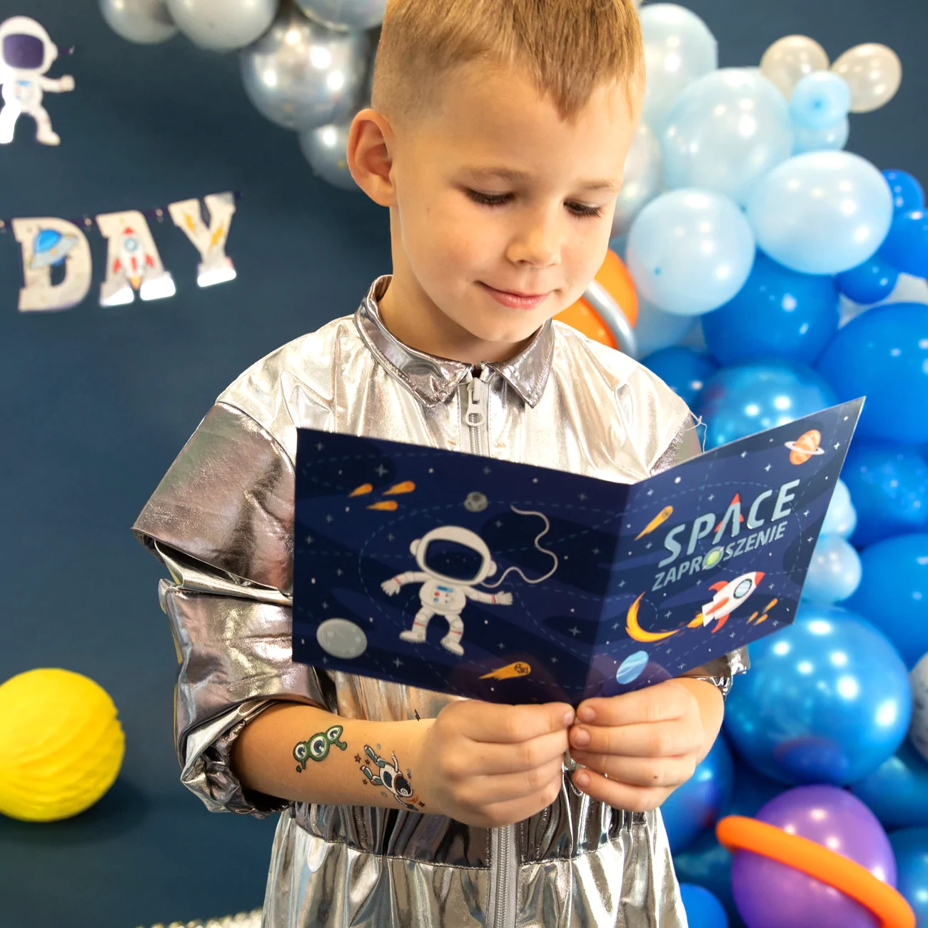 - Zaproszenia na imprezę ze wspaniałą grafiką i miejscem na wpisanie imienia młodego badacza kosmosu oraz lokalizacji i czasu startu kosmicznej zabawy.