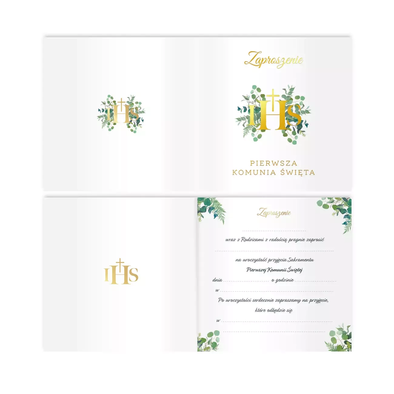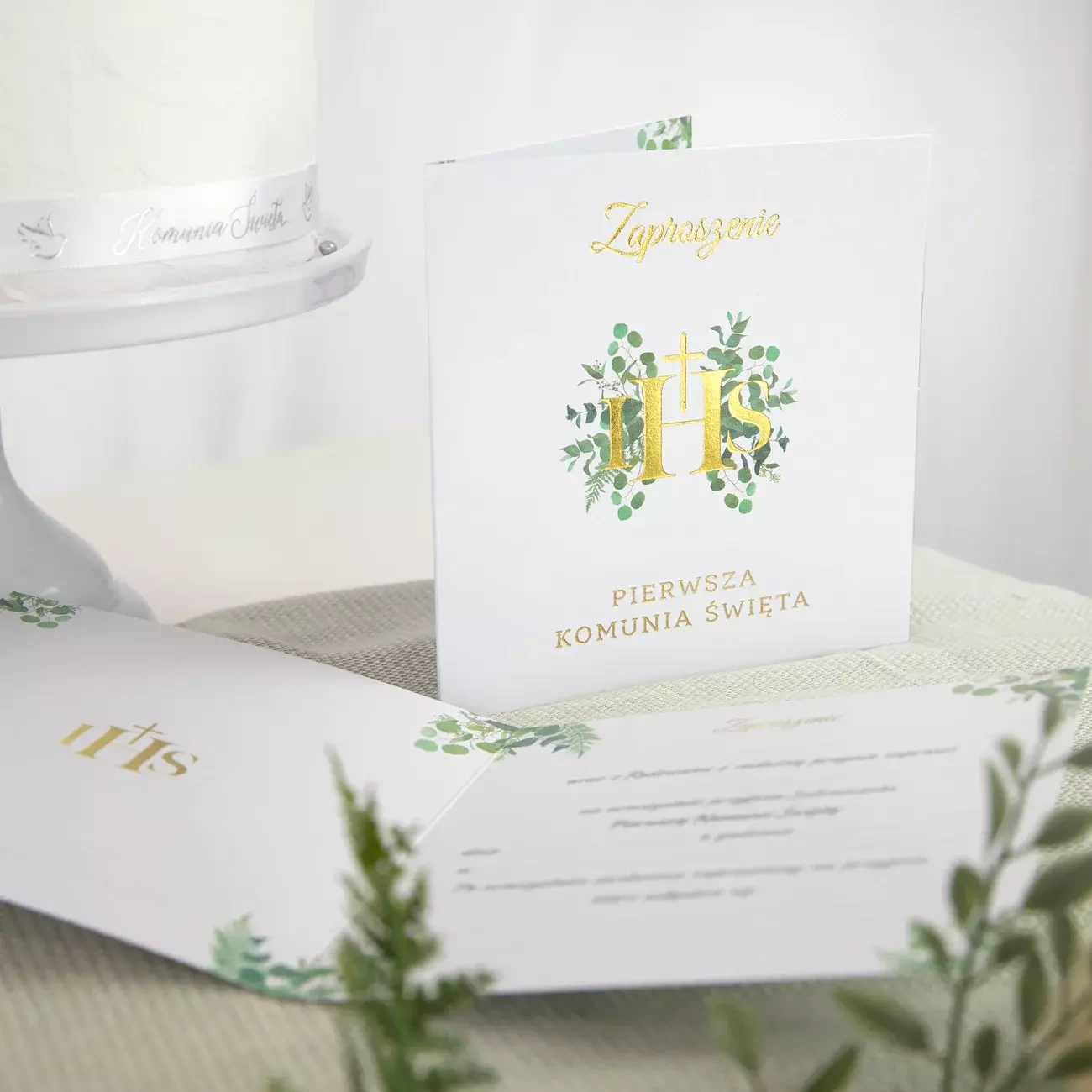 - Głównym motywem na zaproszeniu jest złoty napis IHS z delikatnymi, zielonymi gałązkami eukaliptusa w tle