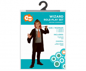 • Zestaw Czarodziej (płaszcz z kapturem, kamizelka z krawatem, spodnie) rozm. 120/130