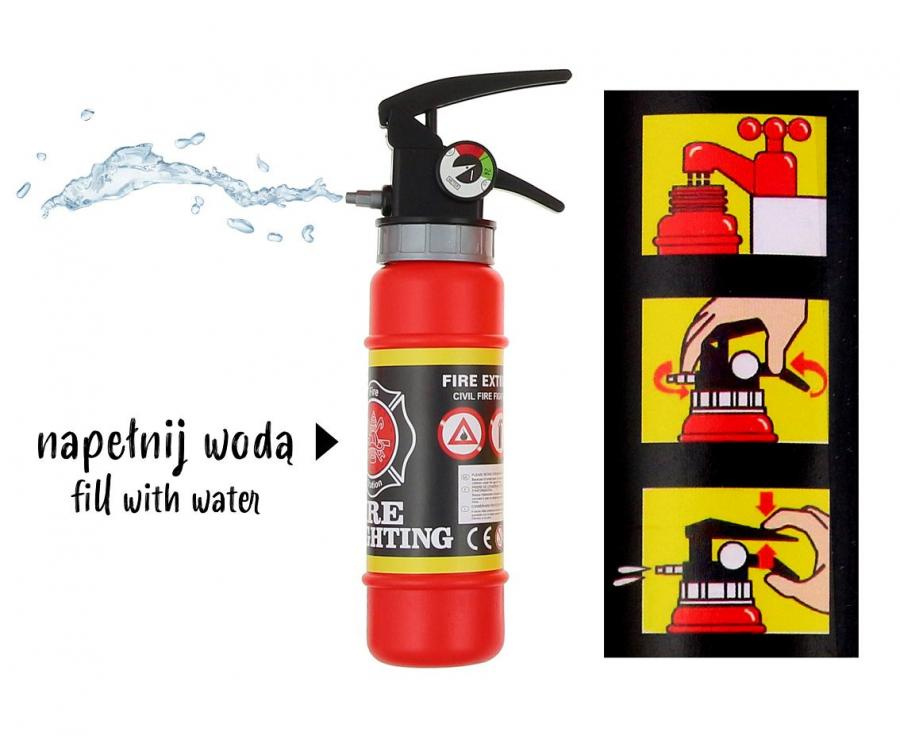 - W skład zestawu wchodzą: kamizelka strażacka, gaśnica, toporek, hełm oraz gogle ochronne